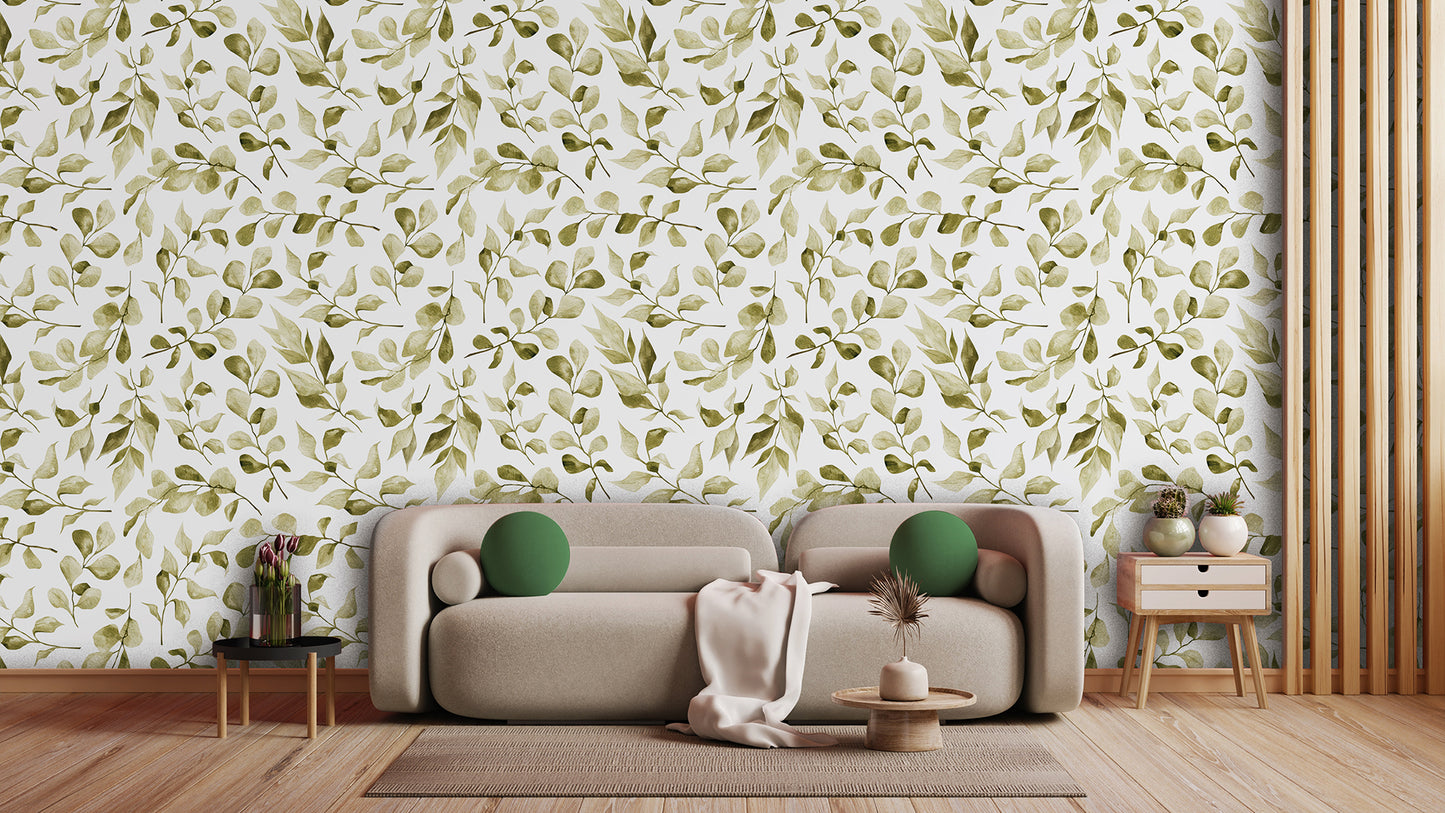 Zart und stilvoll: Die Tapete Botanical Whisper vereint feine aquarellartige Blattzeichnungen in Olivtönen mit einem hellen, fast weißen Hintergrund. Dieses Design schafft ein ruhiges, freundliches Ambiente – ideal für moderne, minimalistische oder skandinavisch inspirierte Räume.