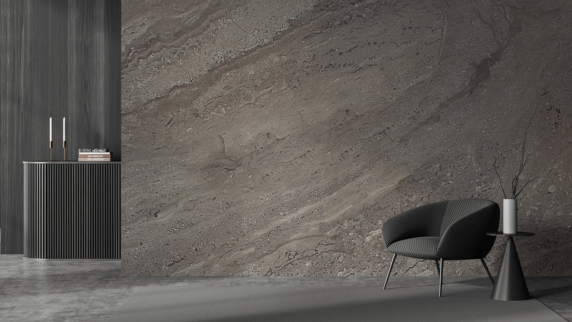 Obsidian Flow Marble besticht durch seine tiefen, erdigen Brauntöne mit subtilen Strukturen, die an verfestigte Lavagesteine erinnern.