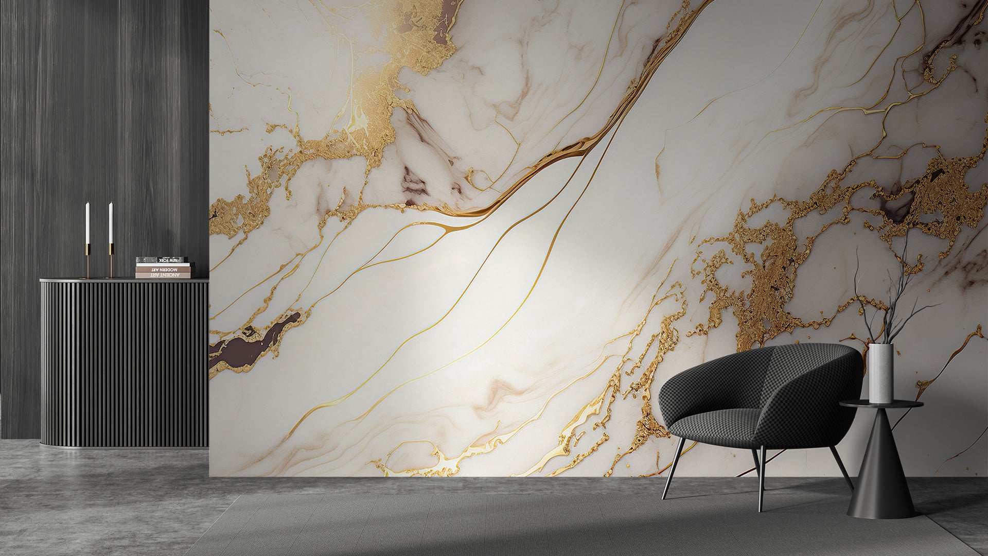 Imperial Gold Marble fasziniert mit seiner harmonischen Kombination aus warmem Cremeweiß, goldenen Glanzadern und sanften Braun-Nuancen. Dieses luxuriöse Design strahlt Eleganz und Extravaganz zugleich aus und verwandelt jede Wand in ein royales Kunstwerk.