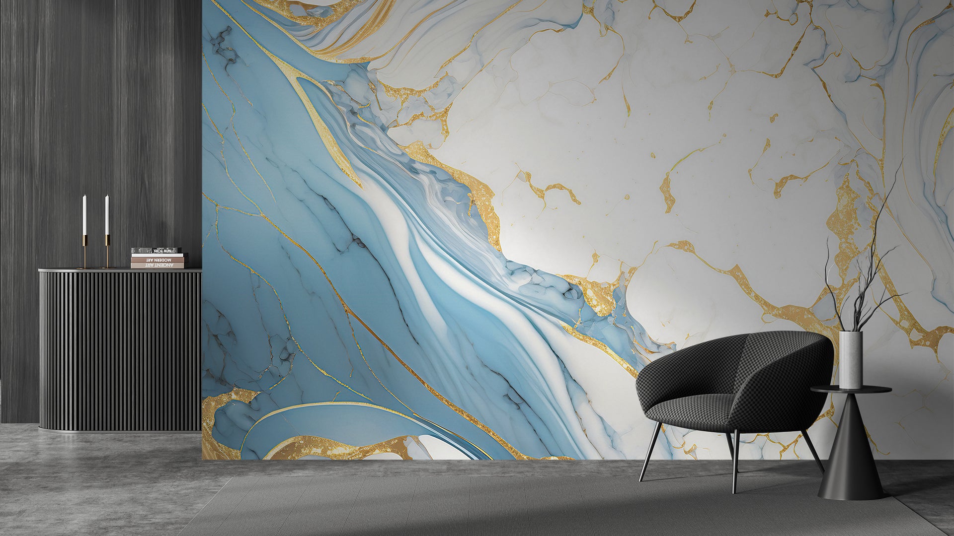 Ocean Veins vereint die Ruhe des Meeres mit dem Glanze des Goldes. Sanfte blaue Wellen fließen über die Wand und werden von goldenen Linien durchzogen, die wie feine Adern wirken und dem Design eine natürliche Eleganz verleihen.