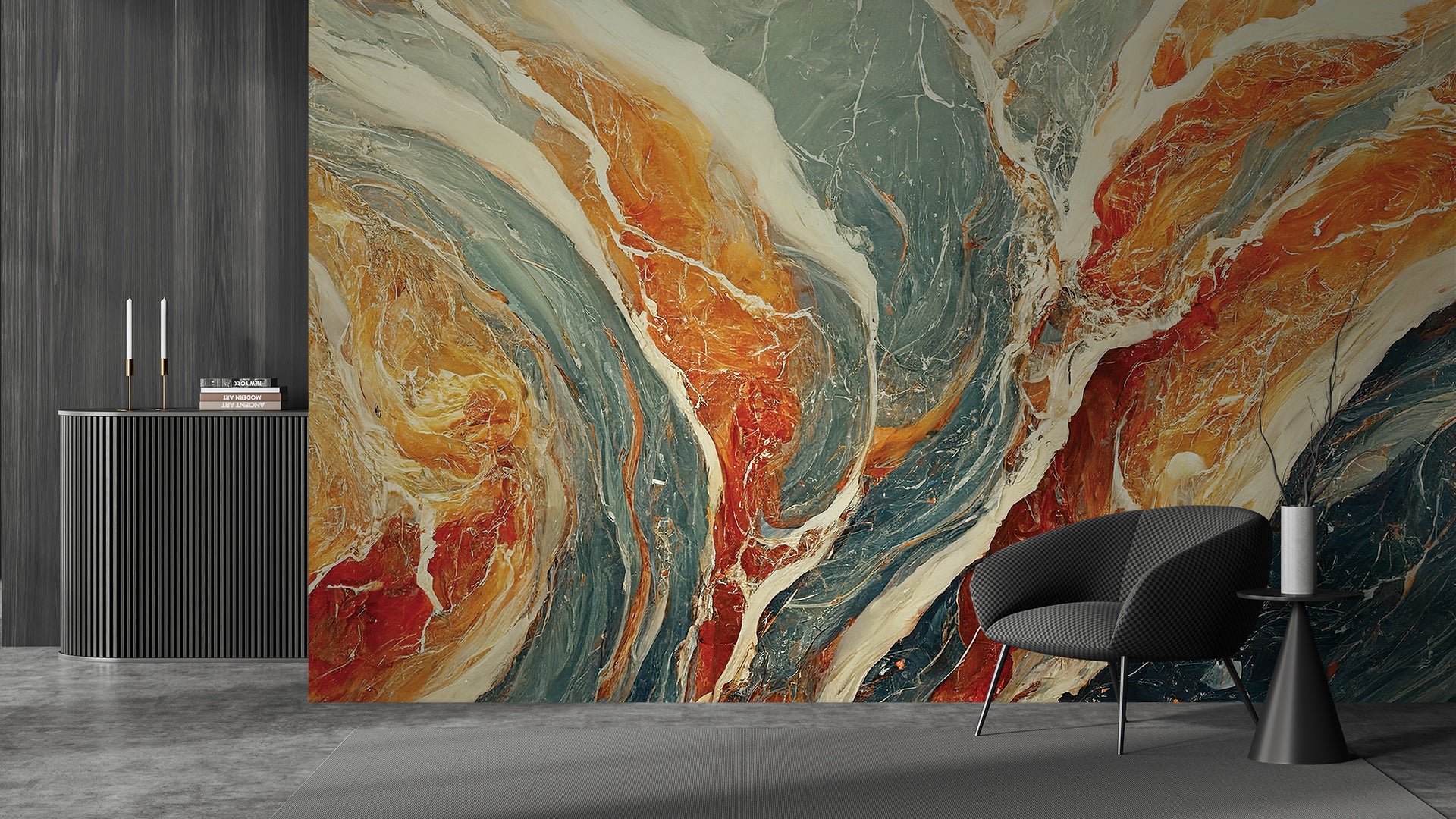 Lava Flow ist pure Energie an der Wand. Die dynamischen Strömungen aus Rot, Orange und Beige verschmelzen mit kühlem Blau zu einer kraftvollen Naturmetapher: Feuer trifft Wasser, Erde trifft Ozean.