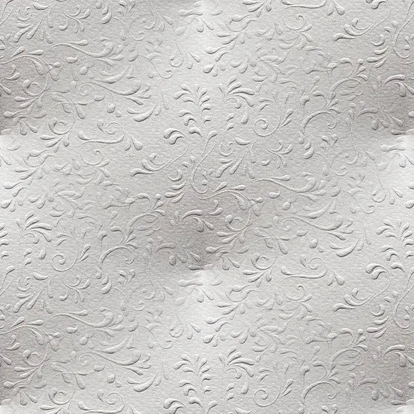 Feine florale Prägungen auf elegant schimmerndem Silber – diese Tapete vereint klassische Ornamentik mit moderner Eleganz. Das dezente Relief sorgt für Tiefe und Struktur, während der silberne Glanz einen Hauch von Luxus in den Raum bringt.