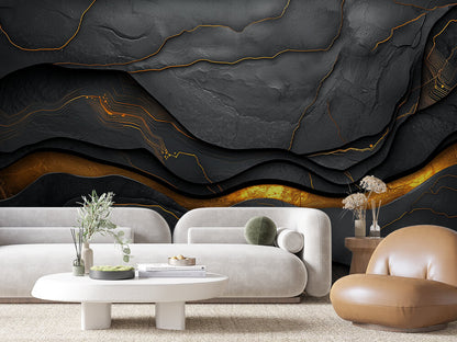 Mit Golden Canyon Layers holen Sie sich die Schönheit zerklüfteter Felsformationen direkt an Ihre Wand. Dunkle, steinartige Strukturen durchziehen goldene Adern und erzeugen ein ausdrucksstarkes, fast geologisches Kunstwerk. Die Kombination aus Tiefe, Struktur und goldenen Akzenten macht dieses Wanddesign zu einem markanten Statement für moderne Räume.