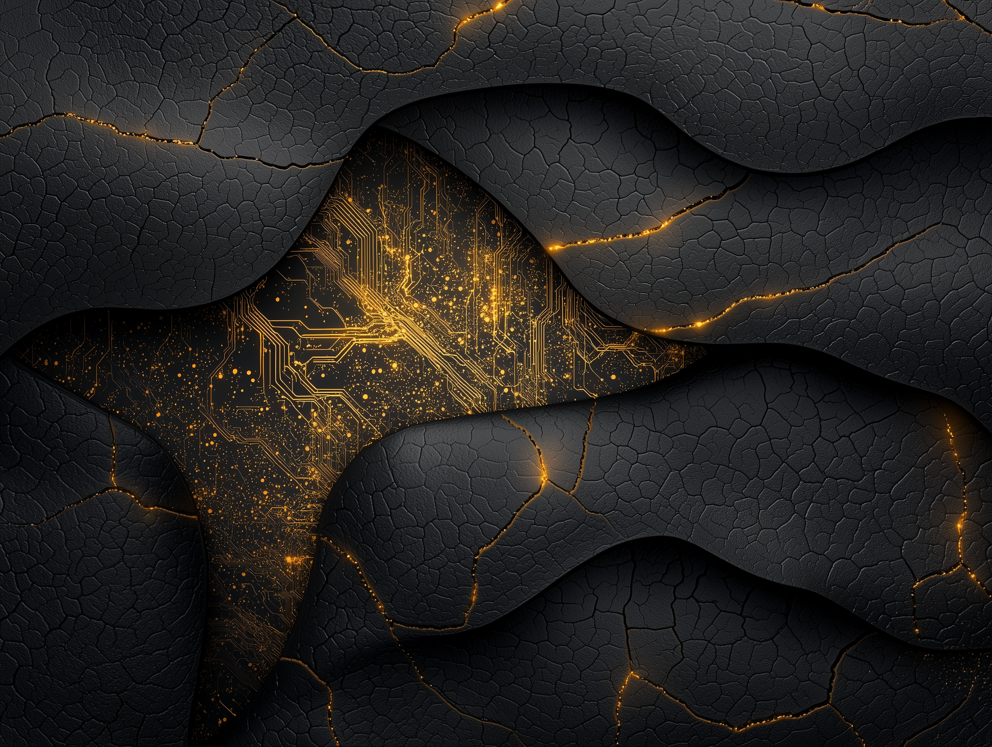 Golden Circuit verbindet organische, schwarze Strukturen mit einem futuristischen, goldenen Schaltkreis-Design. Die aufgebrochenen Flächen offenbaren ein leuchtendes Muster, das wie eine pulsierende Energiequelle wirkt. Diese Tapete schafft eine unverwechselbare Atmosphäre, in der Moderne, Technologie und Eleganz harmonisch verschmelzen.